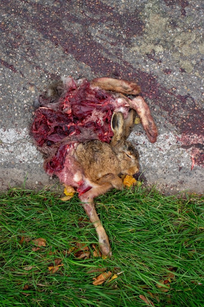 ‘In het spoor van de mens’ legt de gevolgen van menselijke aanwezigheid vast in het landschap. Op en langs de weg fotografeer ik dode dieren – vaak over het hoofd gezien, maar veelzeggend.